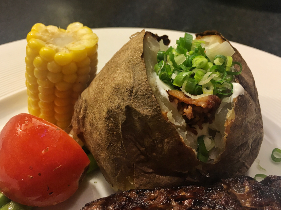 而後服務生會在馬鈴薯上淋上酸奶、培根碎與蔥花,除了培根碎香氣不太重、有點硬之外,熱騰騰又鬆軟的馬鈴薯跟酸奶真是門當戶對☺️