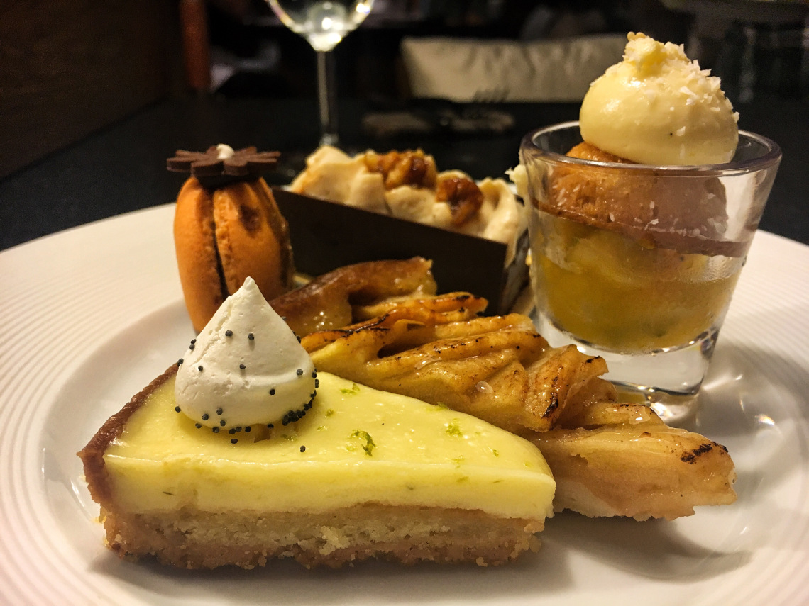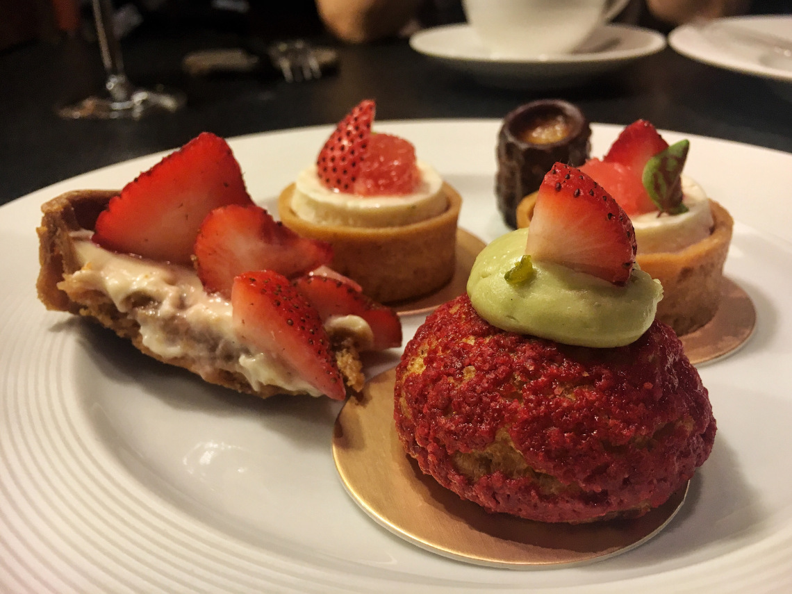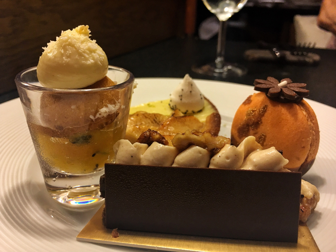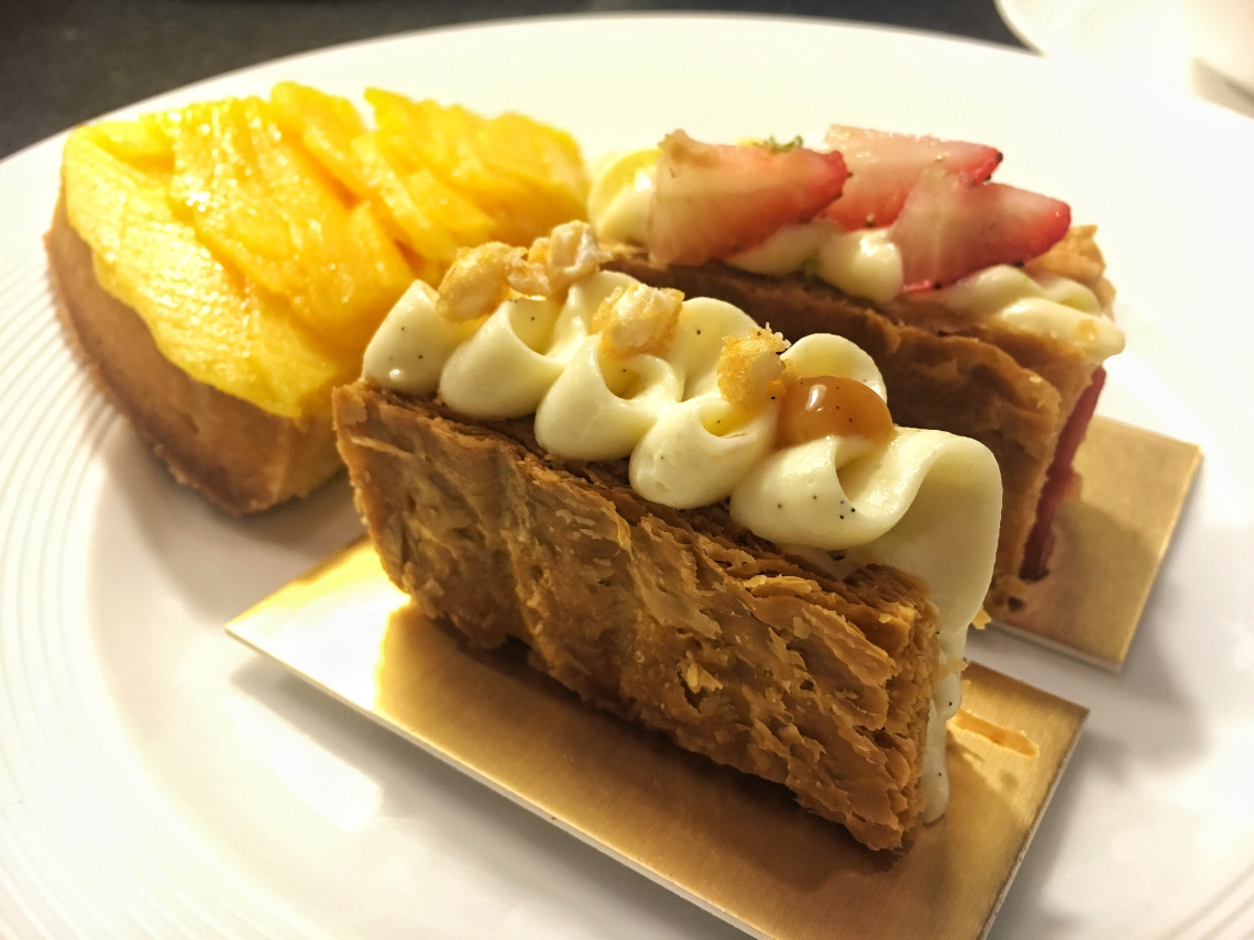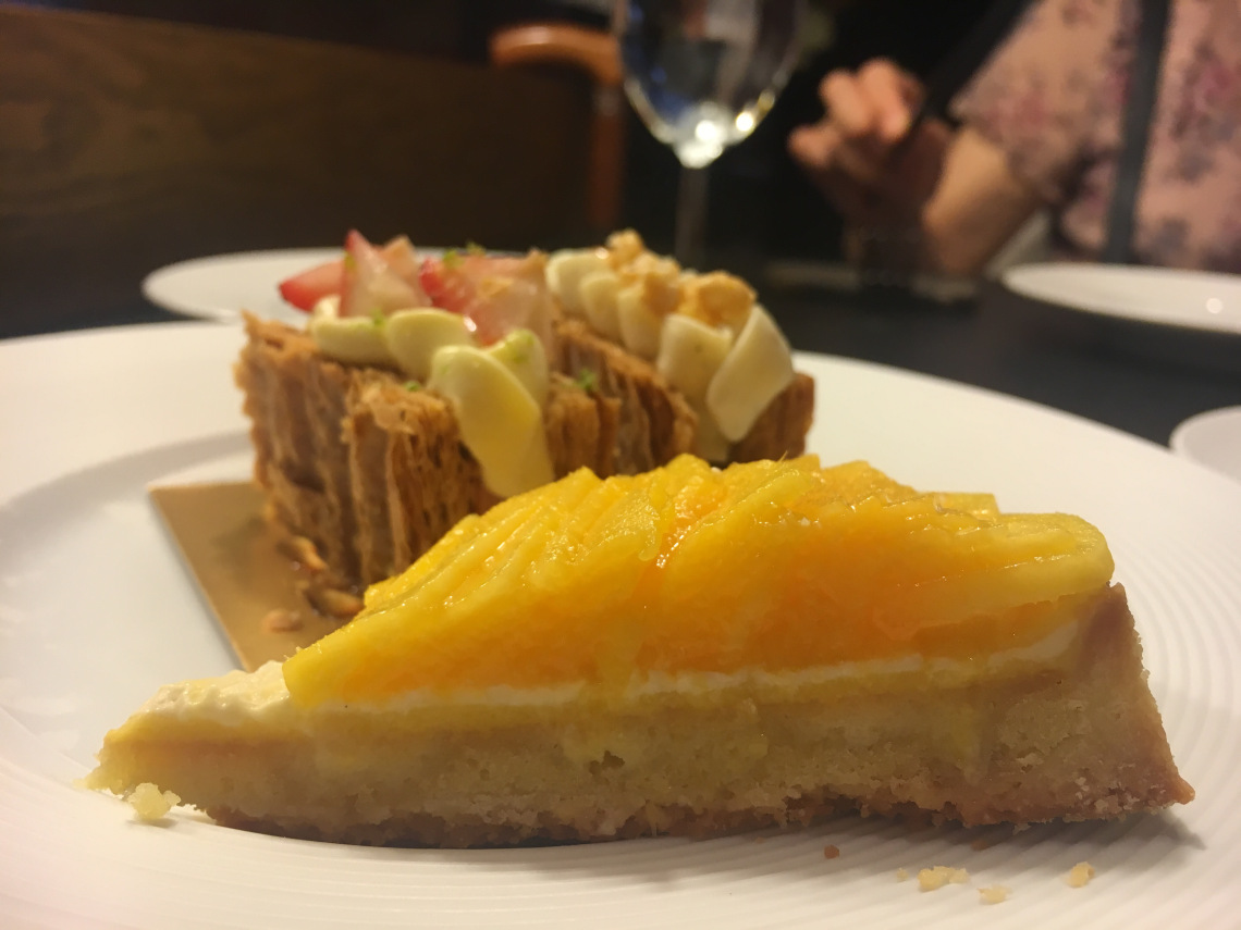 最驚訝的是看到少見的Rum Baba!(法文:Baba au Rhum)之前在巴黎吃到蛋糕浸泡濃厚蘭姆酒的經典版本,這裡則以新鮮芒果醬取代;右邊被巧克力片遮住的布朗尼苦甜濃郁,是今日喜愛的甜點之一↓