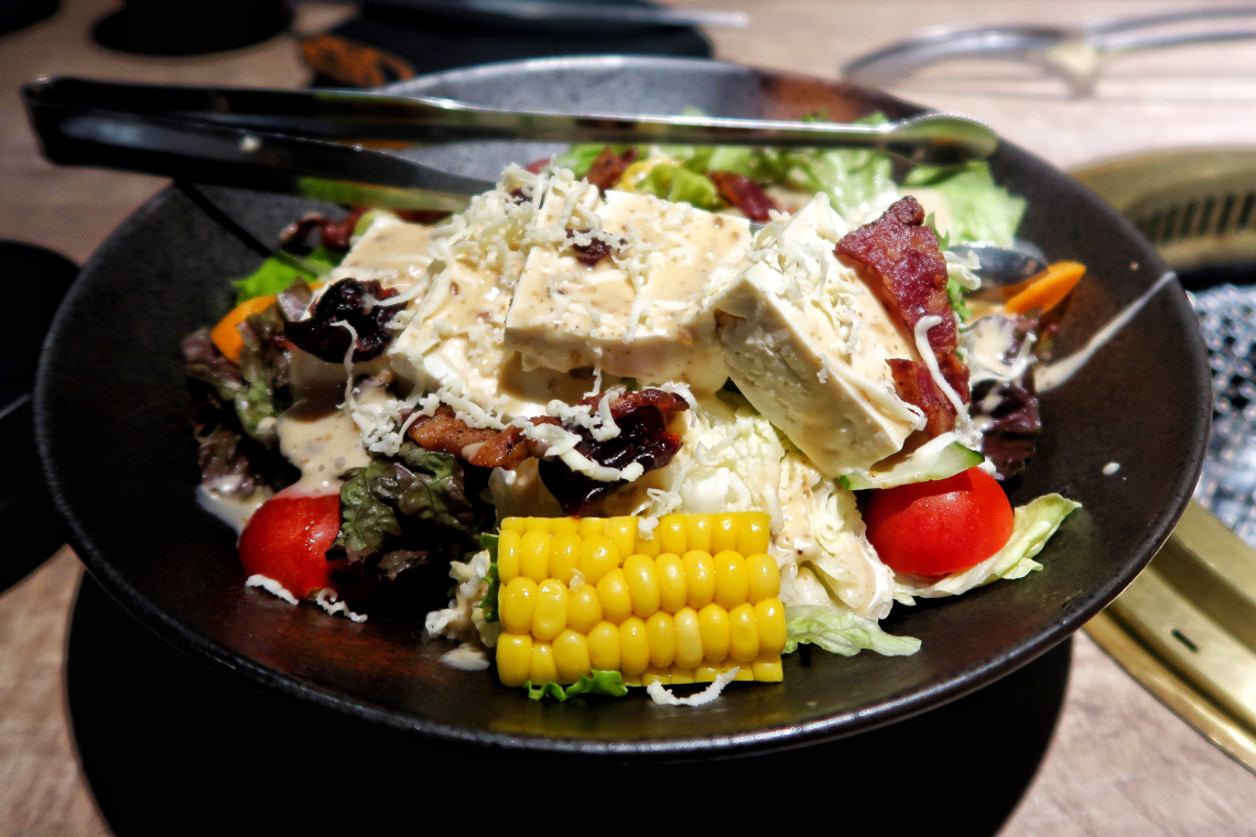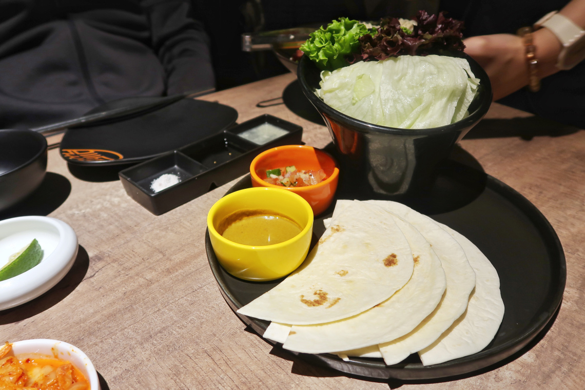 印象中在菜單上沒有看到印度烤餅(?)總之是微微脆的烤餅配上大盆生菜、莎莎醬,與非常印度味的濃郁咖哩醬,是完全沒有想過會在燒肉套餐中出現的菜色