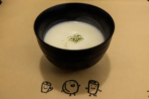 灑上香芹和脆麵包丁,這次喝到的濃湯不是走特濃的路線,牛奶一般的稠度和調味都很順口(紅色小鍋好可愛啊)