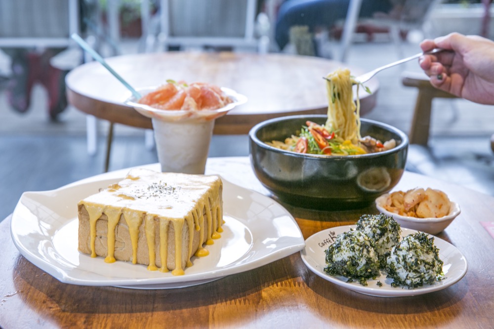 起司片在拉麵上融化,再與湯汁融合在一起,真的跟韓劇裡的泡麵一樣好吃啦~ 不只這樣!!還有三顆海苔捏飯,鹹香酥脆,整個吃更多了🤣