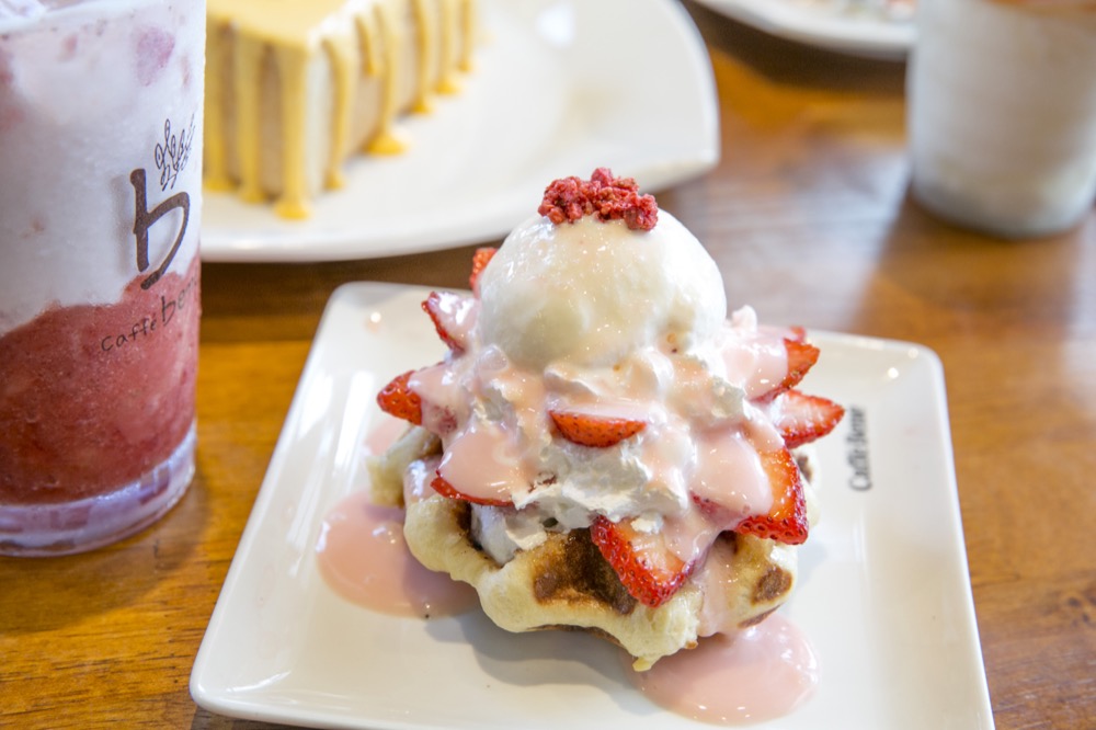格子鬆餅為基底,在冰冰涼涼的冰淇淋上開遍了可愛的草莓花,最上層撒上乾燥草莓粒,視覺上真的好可愛
