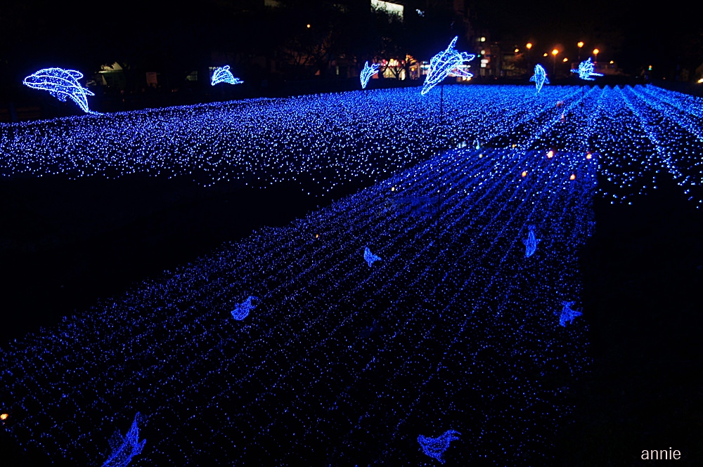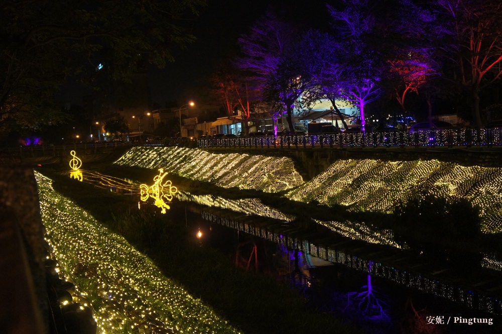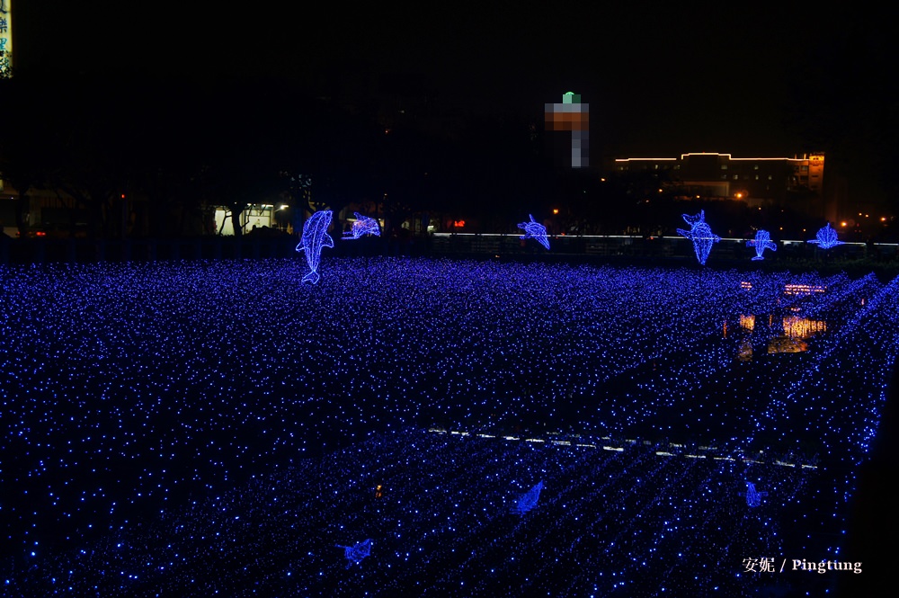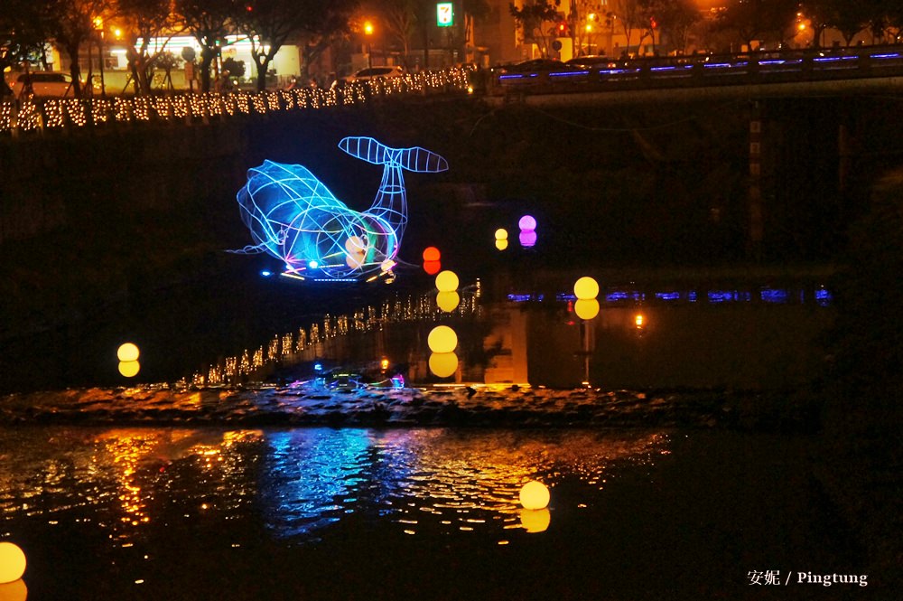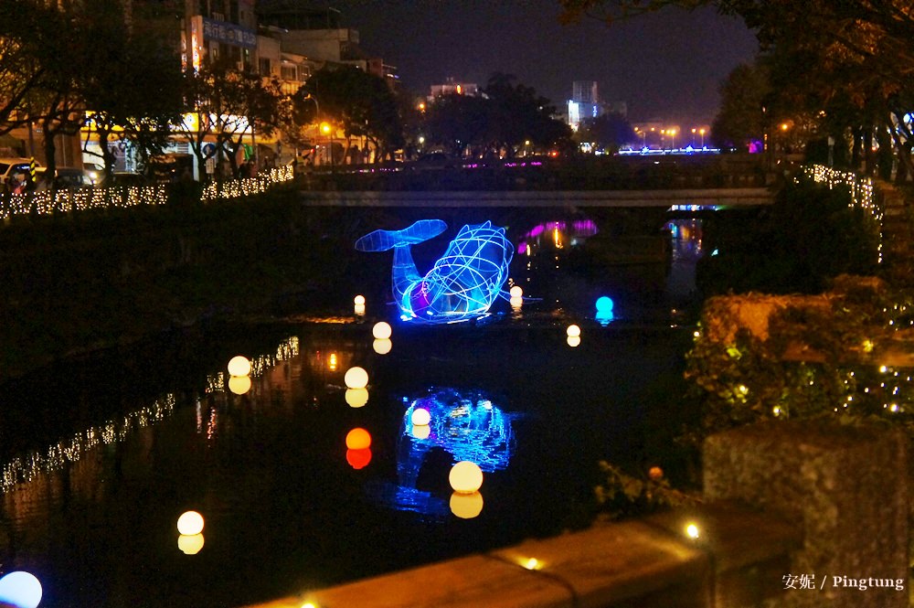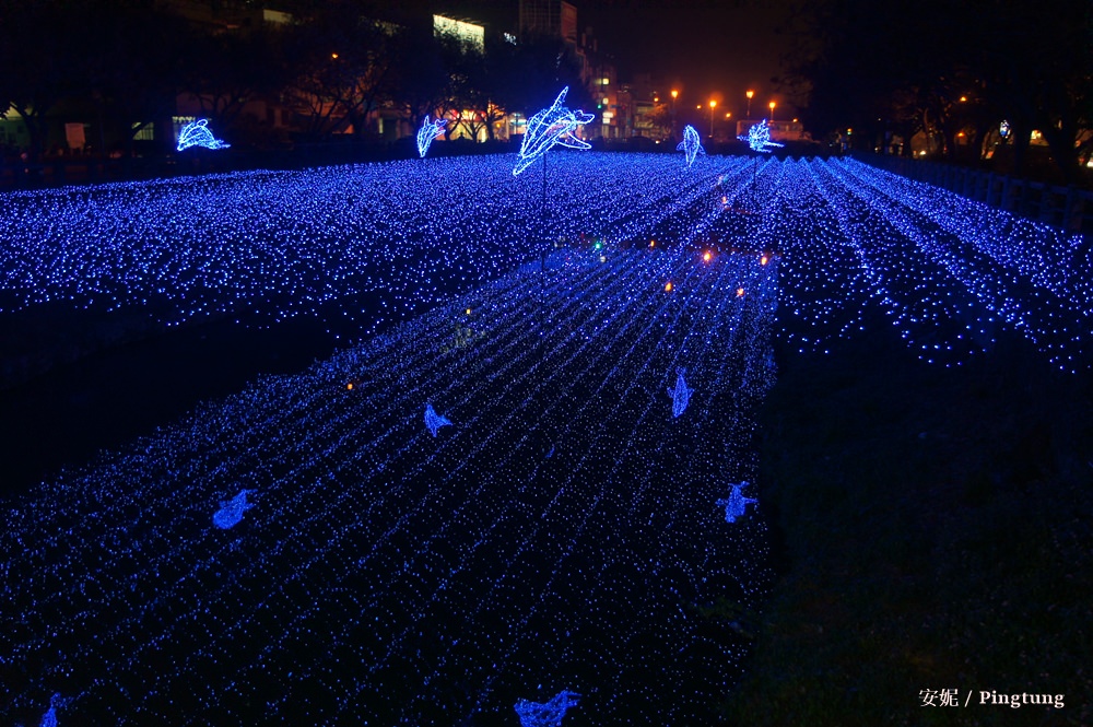 萬年溪最美的一段我會投給位於民生路這段的[飛躍屏東],數十隻海豚飛躍在寶藍色的燈海上,特別的是湖面的倒影,整片寶藍色的燈海壯觀極了,隨著燈光的變換,海豚們彷彿飛躍而起,十分浪漫。
