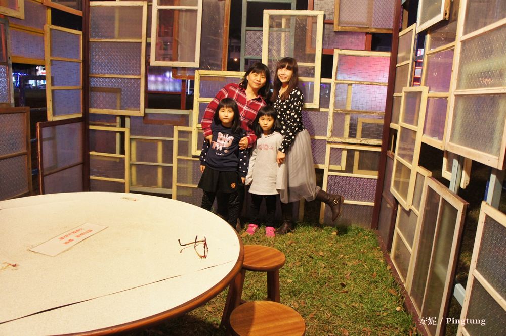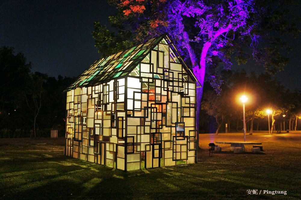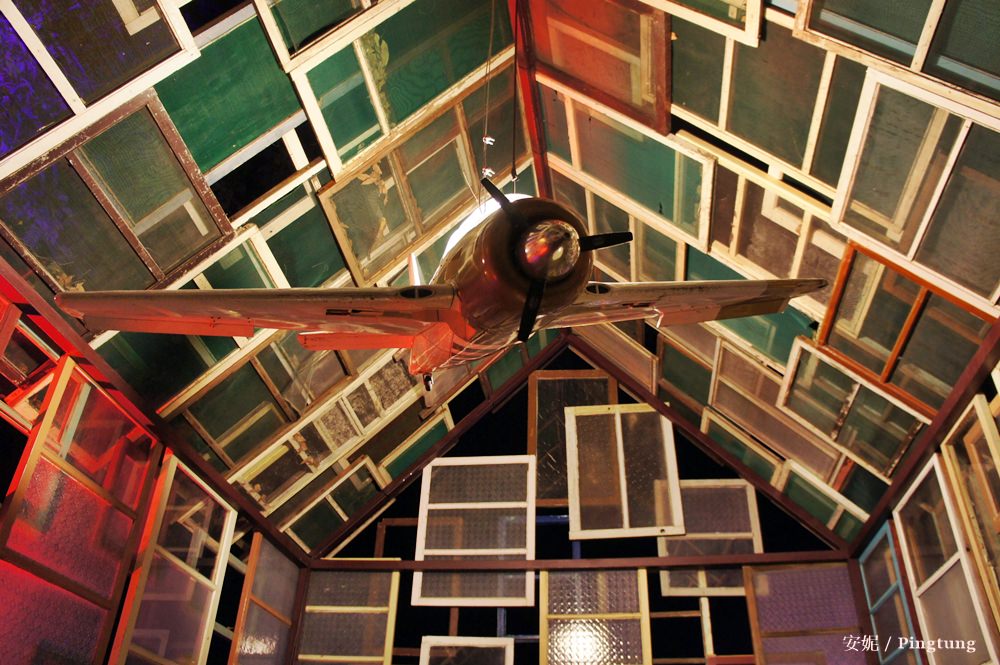 用復古的玻璃窗戶搭建,玻璃屋裡還有架軍機,滿載著眷村回憶,彩色的窗屋將眷村記憶的味道投射在窗格之間,堆疊的玻璃窗也乘載著許多人兒時的點點滴滴吧。