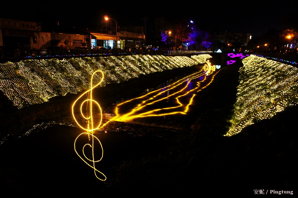 用高音譜記號延伸的光譜,搭配著優美旋律,彷彿,萬年溪也奏起了交響樂,兩側還綴滿金黃的燈光,現場看的時候心底滿是感動啊。