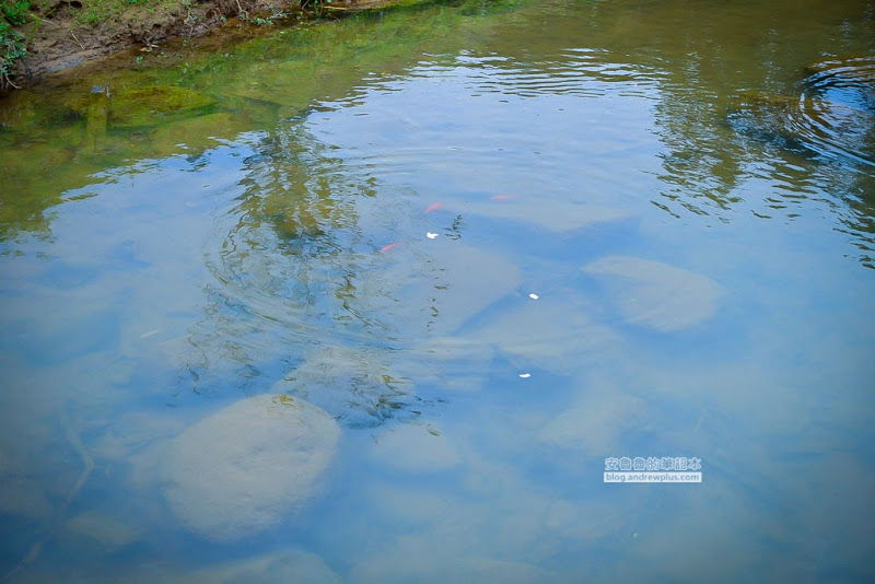 池子裡有小魚,有紅色的也有灰色的,再往前一點還有更大隻的不知道是鯉魚還是台灣鯛