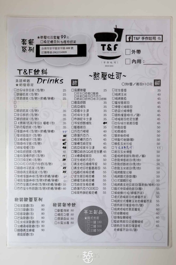T&F除了大同店外,也在安平店落腳開店營運。T&F 是Together and Forever縮寫,為家人做菜的信念來做好吃的早午餐。除了熱壓吐司外,漸層飲品也相當受歡迎。