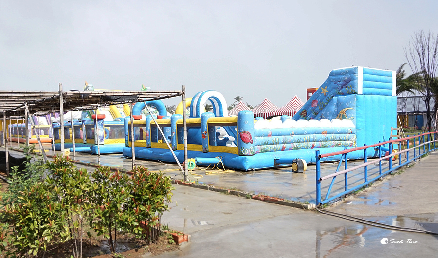 戶外空間有大型氣墊的溜滑梯設施,以及賽車、水上船、小朋友船、火車。