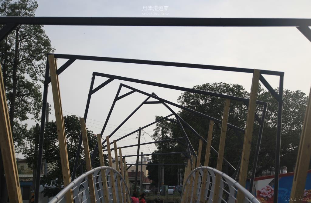創作團隊以現有的自行車橋上以木框搭建了循序旋轉的排列