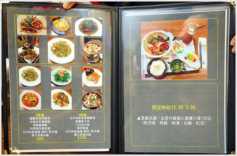 ▼菜單,這裡有提供兩人套餐,很適合第一次來或是不知道要點什麼的朋友!另外12:00~15:00也有提供個人套餐,主餐可以任選再加130元即可升級套餐,就會附上涼菜、時蔬、例湯、白飯與紅茶,一整個超划算!