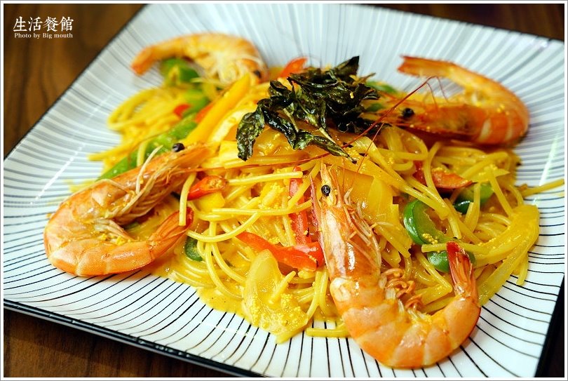 ▼辣味茶酥海膽鮮蝦義大利麵,這道也是非常特別的創意料理,光是上頭的四隻大蝦搭配茶酥就夠讓人驚喜了!