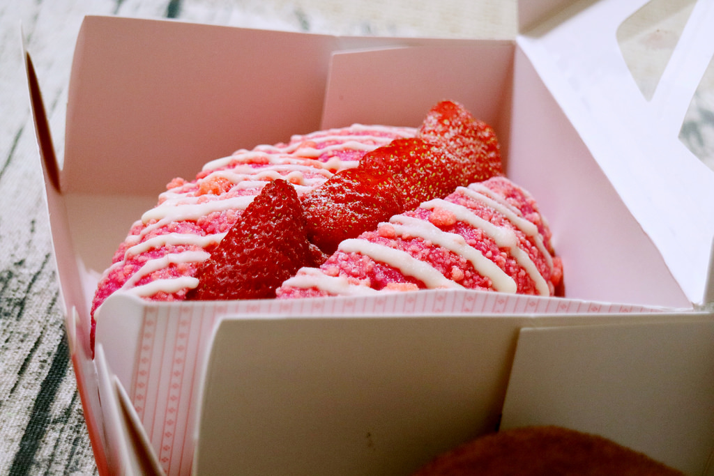 看著紅紅的你以為是色素嗎?那你就大錯特錯了!這是用火龍果打成汁製作的麵糰哦……麵包外皮有點像是菠蘿,裡面包夾新鮮草莓與奶油餡,只有草莓季也就是現在才有呢!要買要快季節錯過就沒了。裡頭的奶油餡不會油膩,吃多也不會噁心,帶一點微甜加上新鮮草莓的微酸,有草莓的產品買下去就對了!