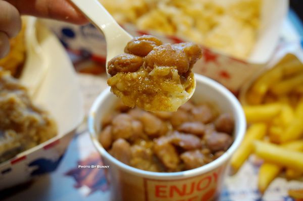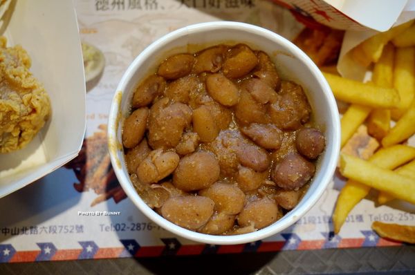 兩樣配餐選擇的薯條及豆泥飯,