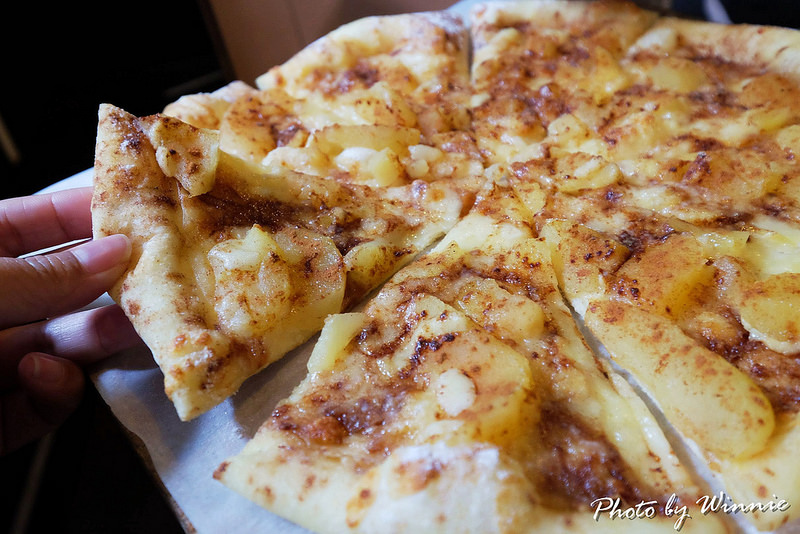 ▲這次我們享用的是「大蘋果」口味,為什麼叫大蘋果當然是跟美國紐約的稱號有關係,而這個蘋果口味的披薩裏頭用的料就是以奶油、蘋果片及莫札瑞拉起司,搭配肉桂粉及糖霜所製作的一款甜披薩。一口咬下甜滋滋的蘋果片還有濃郁的肉桂香氣一下就散開在嘴裏,再加上Q軟的餅皮有加分的效果,我自已一個人獨享這整塊披薩真的hen可以。(大推,必點)