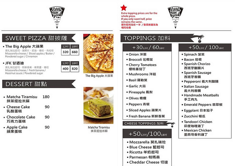▲至於在披薩的品名選項上極具有特色性,特別的以食材的種類來搭配披薩的名稱,並以美國紐約的地區/景點來命名,非常的有創意外也很讓人想試試各種披薩的滋味,除了鹹味的披薩口味,店裏也有經典的甜味披薩也頗受女性朋友們的喜愛,這回我們也有點上一份,後面再跟大家分享心得吧!!