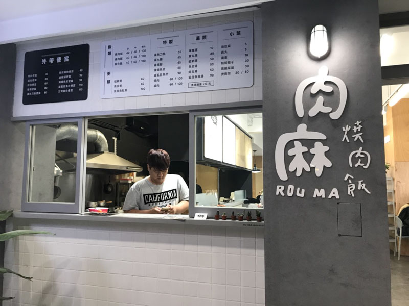 簡約別緻的裝潢風格以灰、黑、白為主色調,放眼望去寬敞的空間,沒有一個椅子是成對的,它們似乎毫無規律,又似乎有它們自己運行的規矩,同時音響裡正播放著The xx 的 I Dare You,如果不是招牌上斗大的燒肉飯三個字,大概會誤以為走進哪間咖啡店或早午餐。但其實他賣的是平價燒肉飯,名稱叫做「肉麻」。像是台語滷肉的諧音,又因為可愛的字樣更像是在撒嬌。