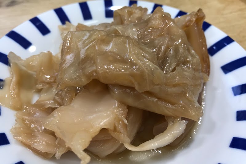 滷至通透的高麗菜滷,淡色薄鹽醬油穿透高麗菜,將每一片菜葉都滷得透軟入味。