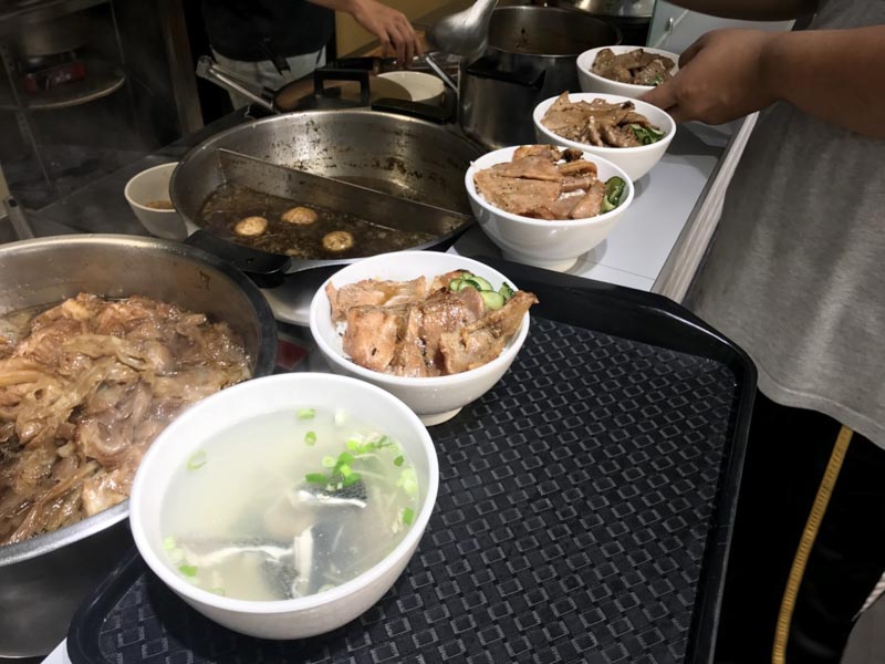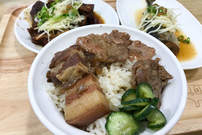 綜合飯,一次可以吃到滷肉、燒肉,滷肉透軟入味,連平常不敢碰的肥肉都滷得入口即化,一點都感覺不到礙口的油膩;燒肉帶著柴燒焦香,嫩口不乾柴,鹹甜口感相當下飯。