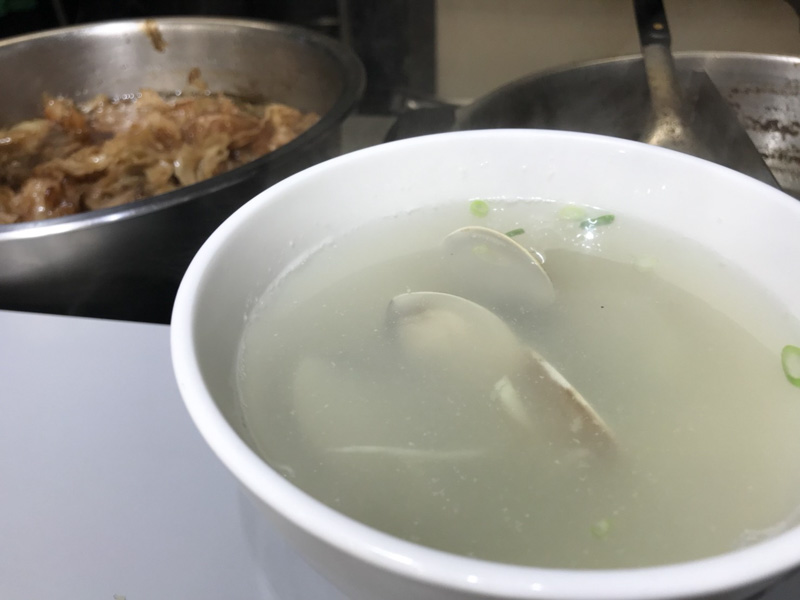 蛤蜊湯,高湯滾後將新鮮蛤蜊放入後立刻起鍋,保持蛤蜊肉最鮮甜飽滿的樣子,配上一點薑絲與蔥花就是在地最經典的美味,可惜我的友情套餐吃太飽,完全喝不下只好拍別人的。