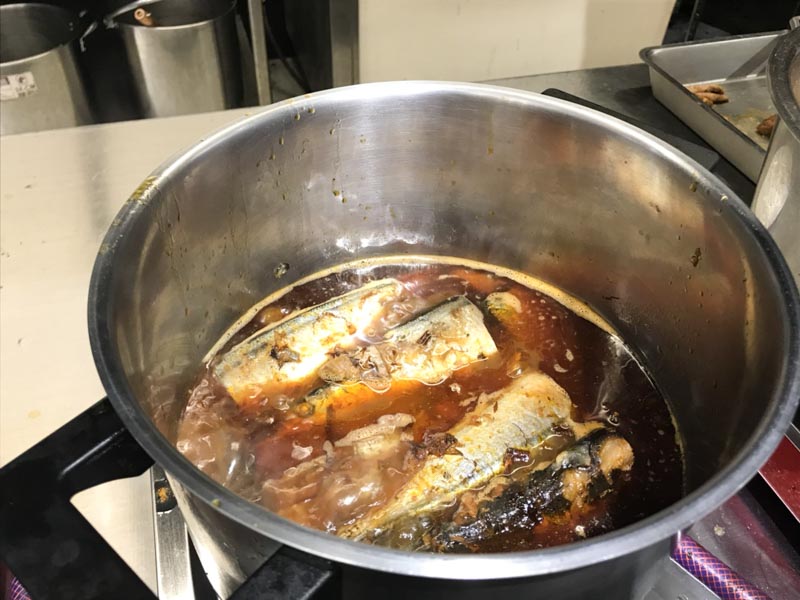 滷秋刀魚,在吧檯邊看著鍋裡的醬汁不斷滾動秋刀魚,讓在滷汁裡泡煮著的魚身看起來更加可口。