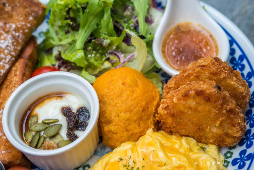 有歐姆蛋 自製優格 薯餅 和風沙拉還有軟法吐司