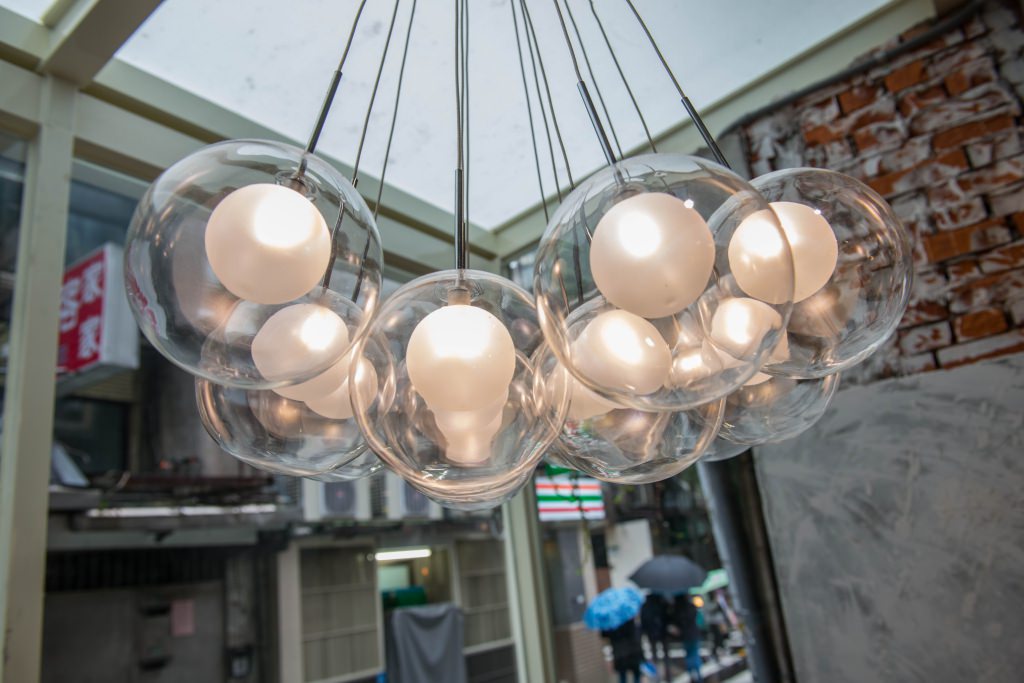 冷色調與剝落的紅磚牆搭配吊燈還有乾燥花,