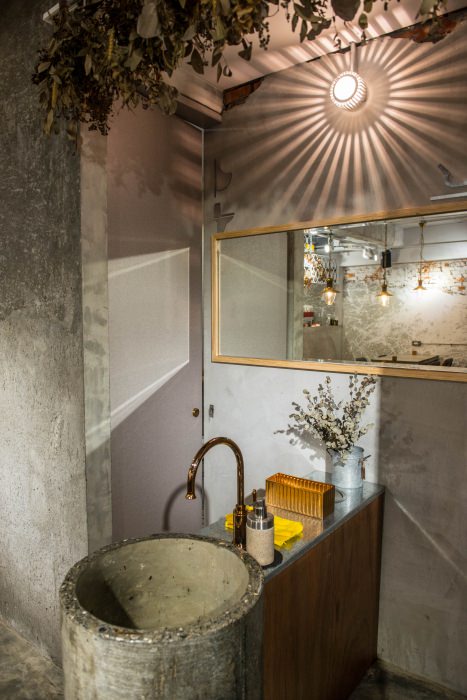 水泥跟大理石的冷色調搭配暖色調的吊燈~美