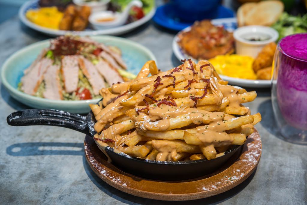 現炸薯條上淋著特調的花生醬最後撒上糖粉跟培根