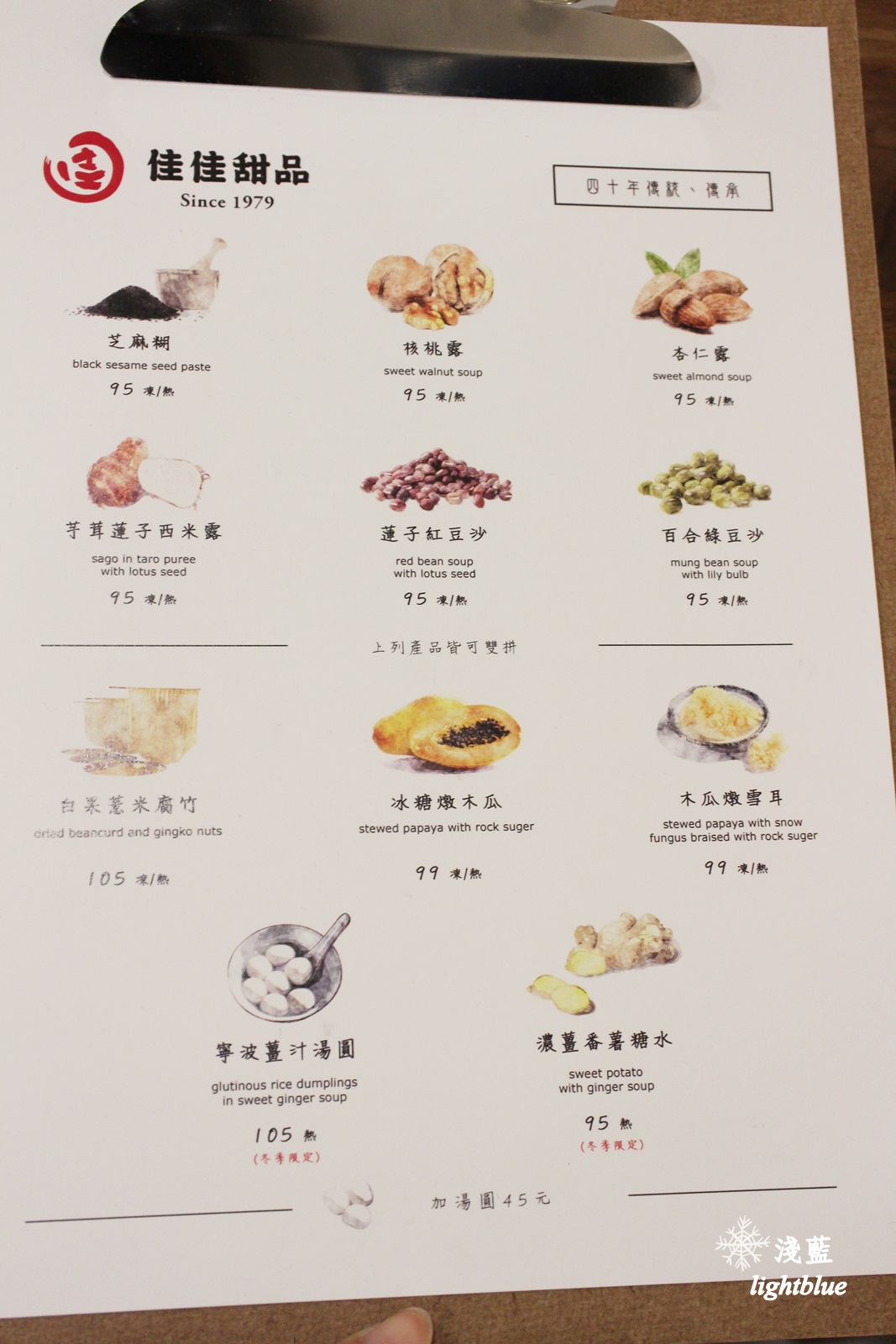 內用外帶都在櫃台點餐結帳,菜單如下,就這麼一張,上方六種可以雙拼,都是95元,凍的熱的都有,每一種也都可以再加45元的湯圓