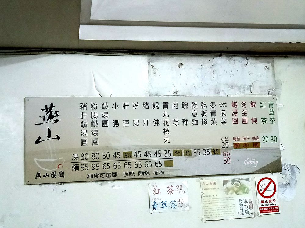 燕山湯圓是舊雙連市場裡傳承50年的好滋味,每天以自家親磨的糥米漿包入鮮肉,加上親熬的大骨湯,湯鮮皮Q內餡香。特別的是可以在湯圓中加入豬肝或粉腸,還能加麵、冬粉或板條等,是一吃會上癮的傳統好味道。