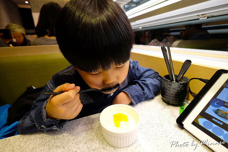 ▲小貴人本來就很愛吃壽司,加上這樣的賽車送餐方式對他來說是更加的具有吸引力,對我們來說也樂個輕鬆,就交給他去負責端盤子取餐就好了!!(P.S車子送完餐之後會自行的感受再開回去廚房內哦!)