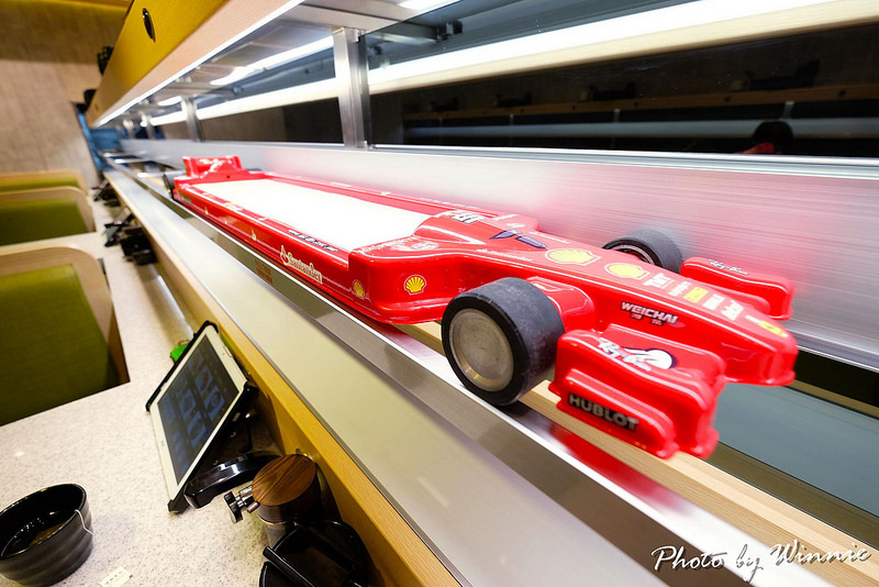 ▲就是這台酷炫的紅色跑車,它搭配採用的是日本原裝新幹線的點餐系統,每次可以現點現做由廚房出餐至顧客指定的客席座位區,不僅快速又穩固,且精準到位!!