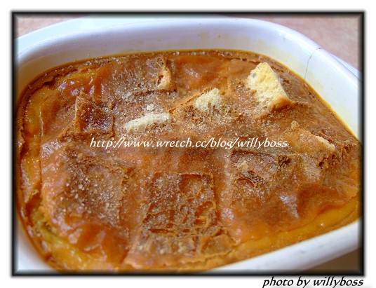 份量蠻大,吃起來有點像蒸蛋,可以吃到一些厚片麵包的切塊,我記得知名大賣場大潤發的麵包部也都有賣這一道點心,差別只在表面顏色,還有大潤發的是冷的。
