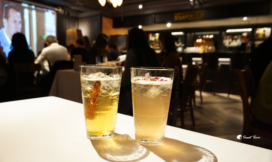 右邊為「夏戀玫瑰花果綠茶」,酸酸甜甜的花果茶灑上玫瑰花,粉粉的色調好美耶,非常少女的一杯飲品,喝起來也很解膩,超適合飽餐一頓後飲用。