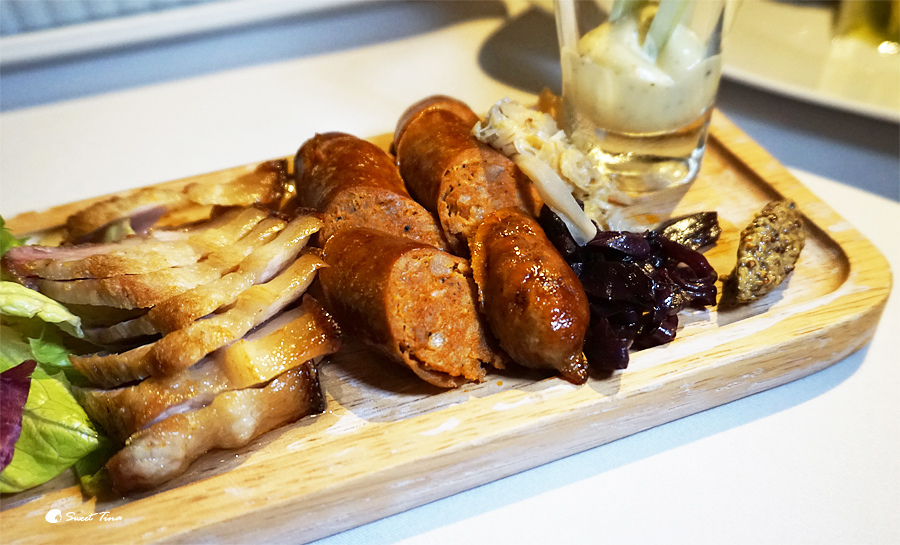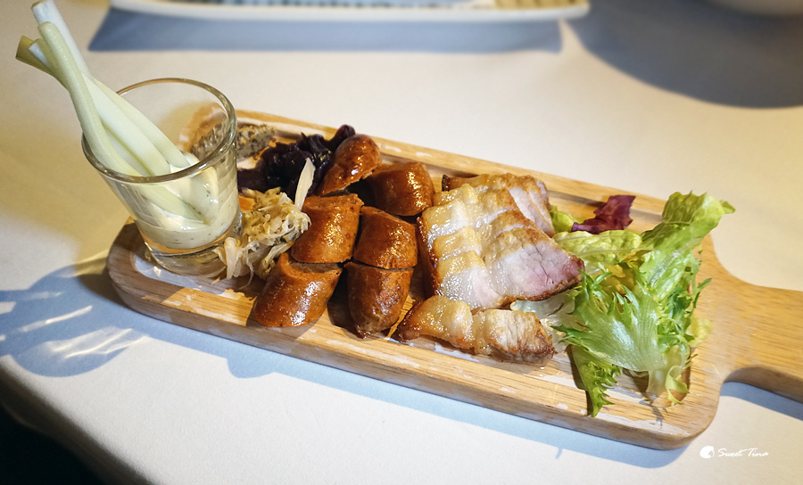 除了手工肉腸及培根外也附上了蔬菜及醃製配料,搭配著吃能平衡些油脂,吃起來也不會覺得膩口,這道好適合當下酒菜,好想說來一杯酒啊!!