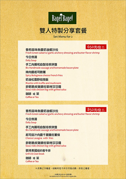 這次要與大家皆享的是BagelBagelCafe Bar的雙人特製分享套餐(850元/位),可以以較實惠的價格同時享用多道特色餐點,即使是二個人的約會也可以很豐盛呢。