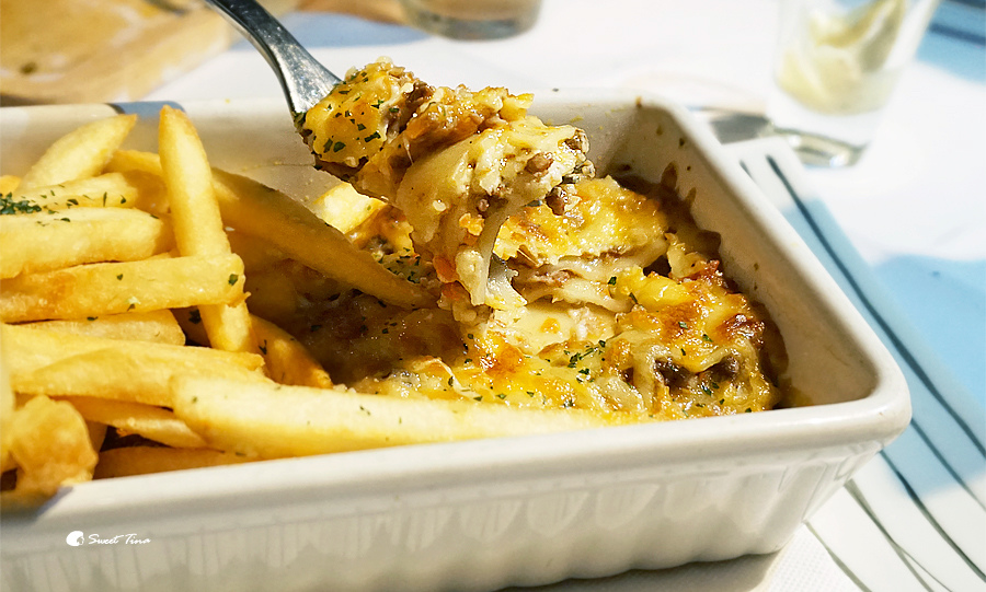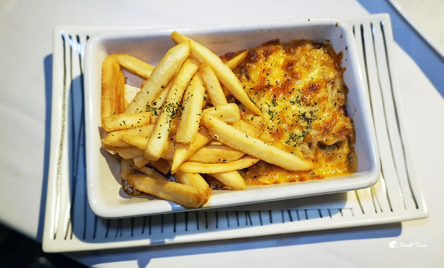 肉醬千層麵搭上濃郁的焗烤起司,不僅香氣十足也有飽足感,而薯條也料理的不油不膩,冷掉後也還不錯吃喔。