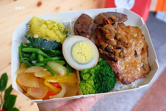 單樣主菜便當價格從80元起跳,不過也有不少常客會選擇雙拚方式,目前打卡還有送香腸,所以我就選擇一個排骨+雞肉絲,再加上店家贈與的打卡主菜,光是看擺盤就覺得超澎派的啦!