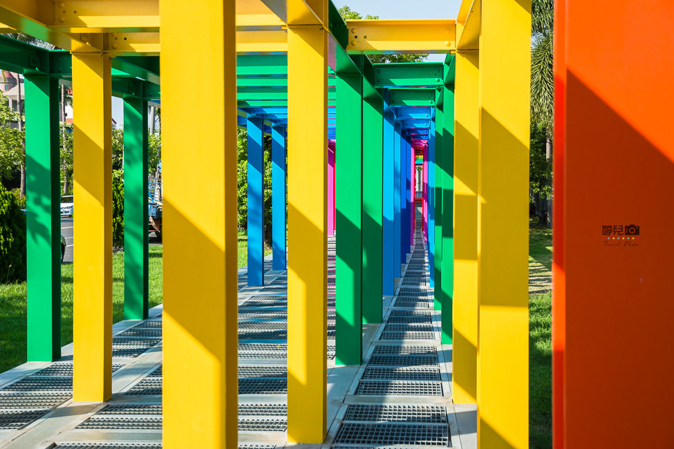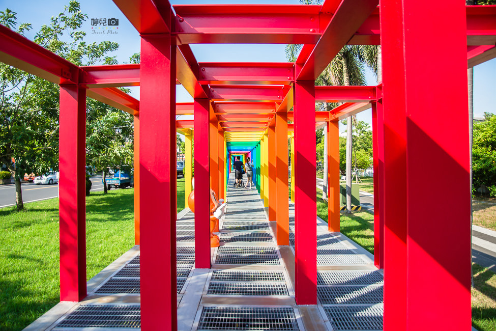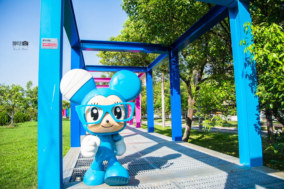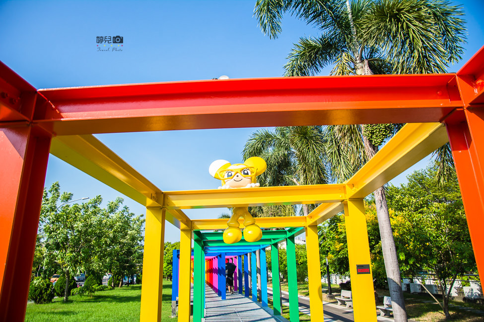 新營美術園區主要主題就是這座彩虹長廊,由藝術家不二良所創作,彩虹長廊裡穿梭著可愛的小鼠公仔,
