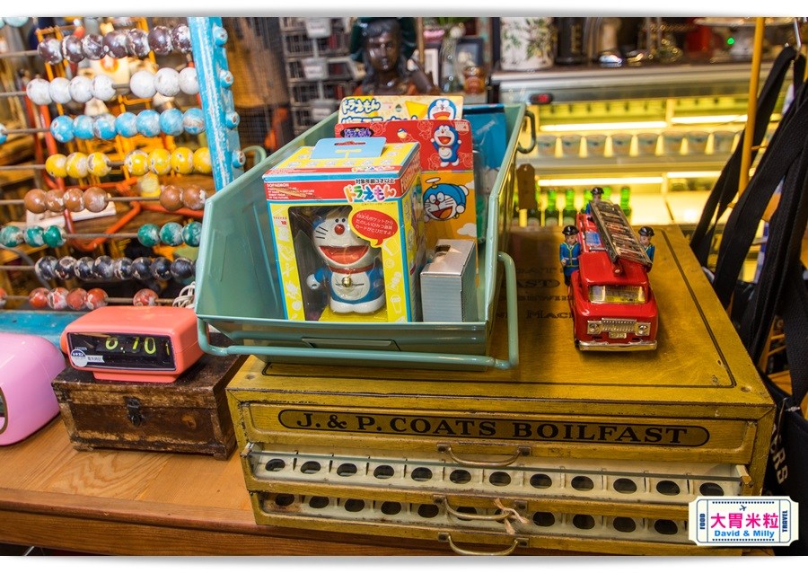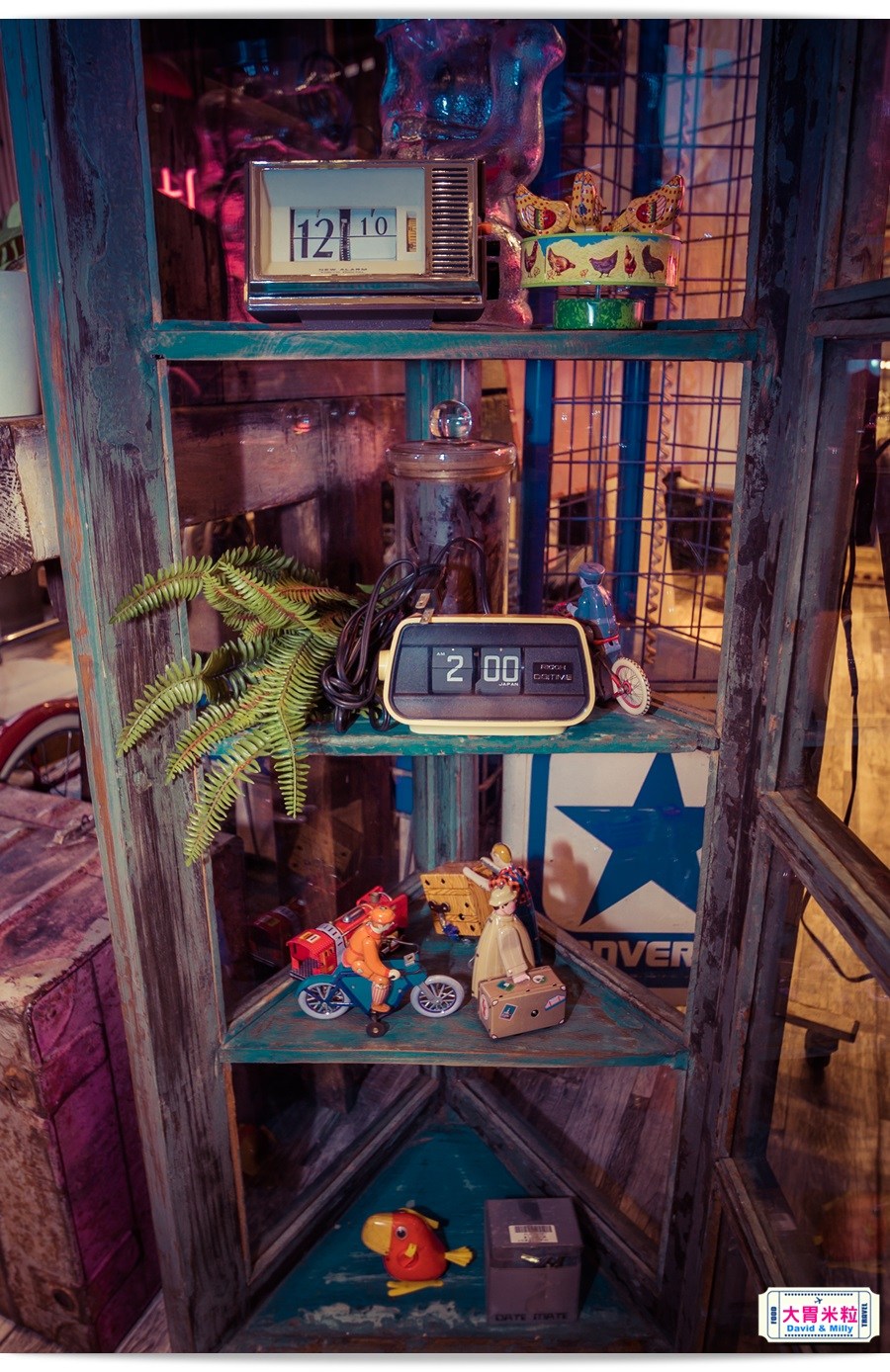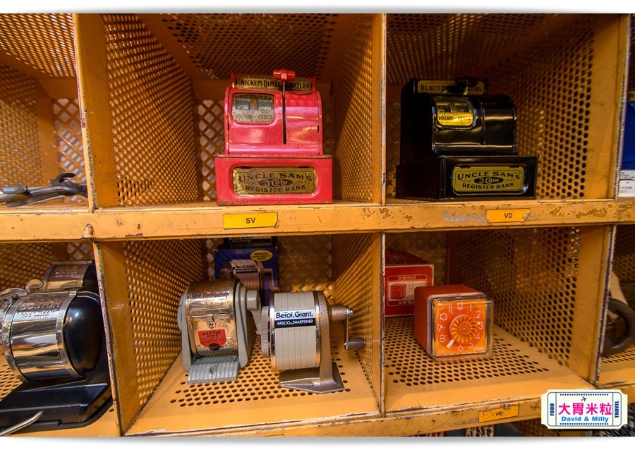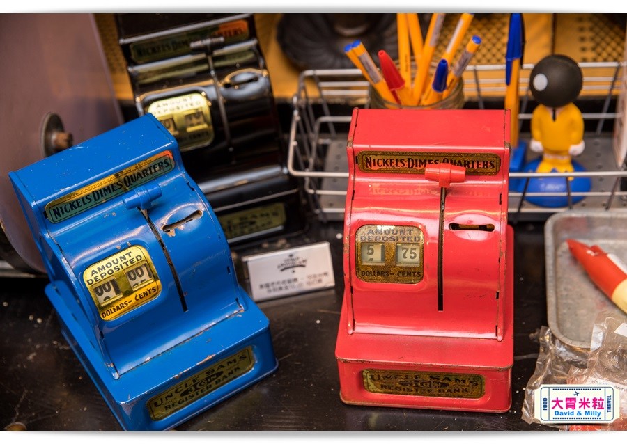 第二區鐵櫃,擺上各種復古存錢桶與文具,聽闆娘分享這個黃澄澄的鐵架,可是國外郵差分信櫃,看起來非常有年紀,現在作為收納櫃相當合適!