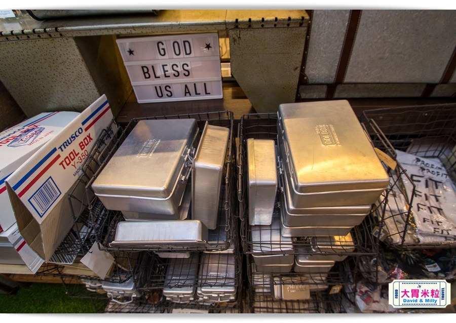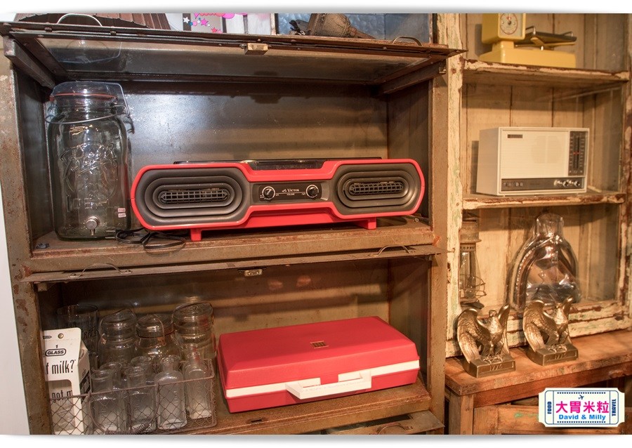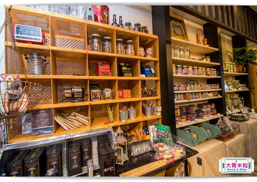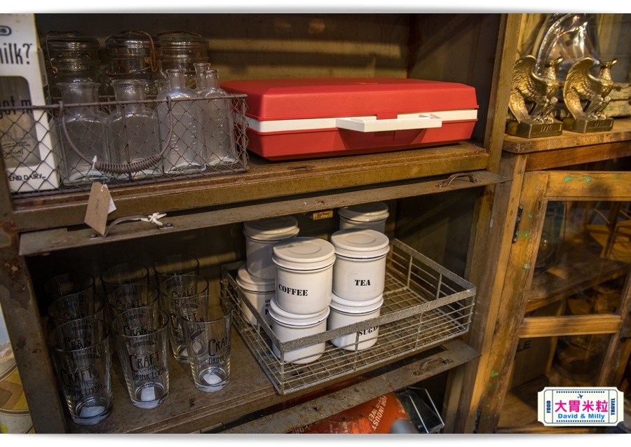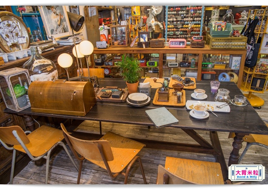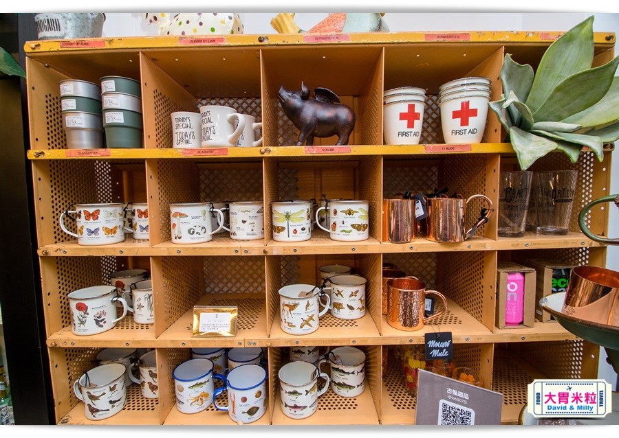 第二區鐵櫃,擺上各種復古存錢桶與文具,聽闆娘分享這個黃澄澄的鐵架,可是國外郵差分信櫃,看起來非常有年紀,現在作為收納櫃相當合適!