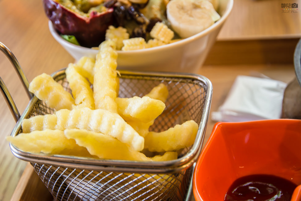 吃下去有滿滿的滿足感,而一旁的生菜沙拉裡有堅果和各種水果,吃完飽足感整個提升。