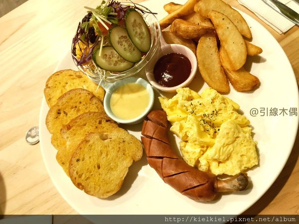 份量很大!有帶骨德式香腸、香蒜麵包、美式炒蛋、鮮蔬沙拉、酥炸薯塊。