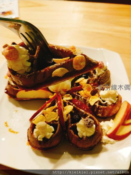 讓人眼睛一亮的份量與擺飾,鬆餅以各別獨立的水滴型拼圈,每個接縫兩側都貼有削片蘋果,灑滿綿花糖、脆片跟藍梅。中間的冰淇淋則與店主題貓咪相合,是貓掌狀的。色彩繽紛夢幻可愛,很少女風~