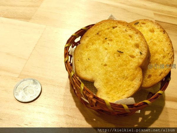 麵包提供香蒜麵包兩塊,蒜醬均勻抹實。