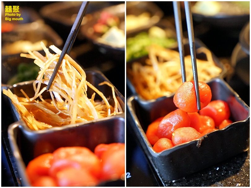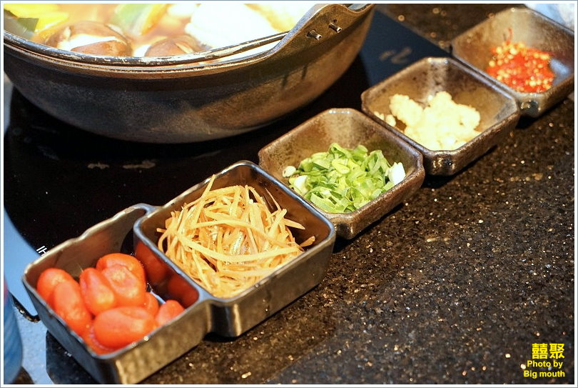 ▼桌上擺放的是醃漬番茄、牛蒡絲兩種開胃小菜及蔥、蒜、辣椒等配料,蔥、蒜、辣椒可以搭配日式醬油享用,讓醬料風味更多元!