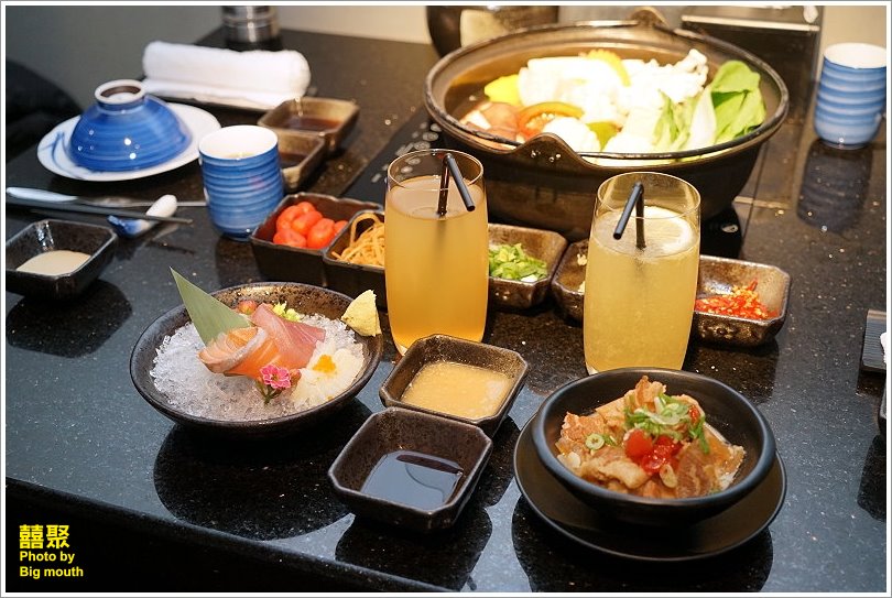 ▼一開始上桌的是火鍋、前菜、飲品與醬料,瞬間就快把桌子擺滿啦!