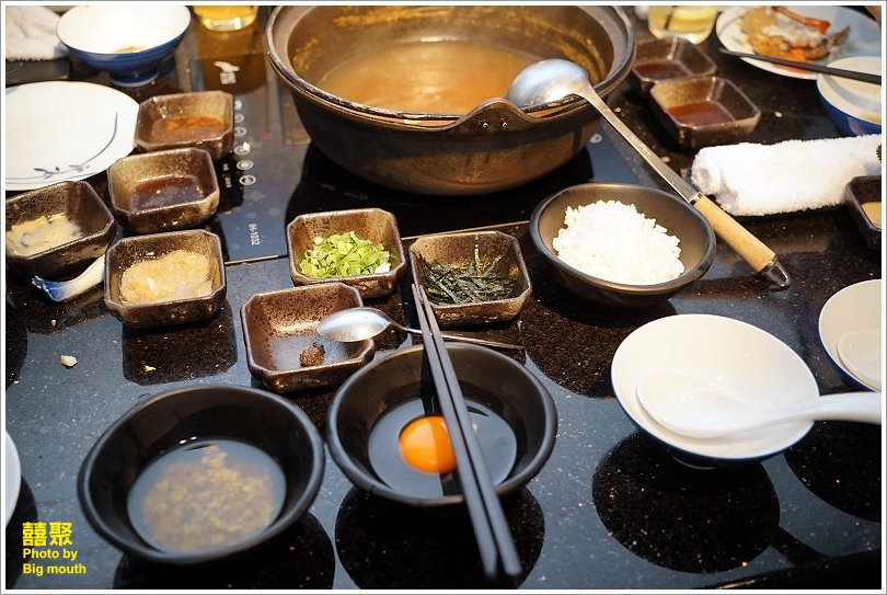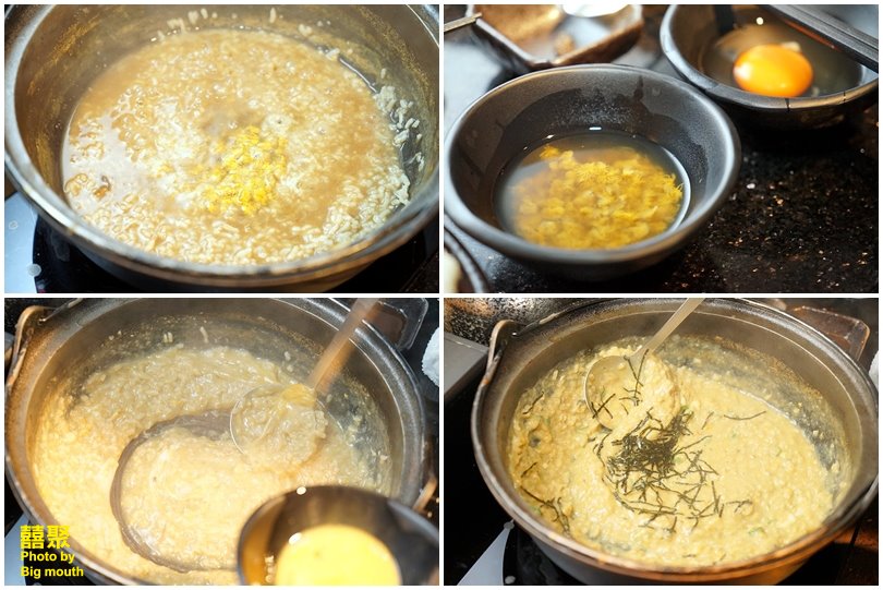 ▼首先服務人員先將湯底的餘料撈乾淨後,再加入原味高湯讓湯底不要太過鹹重,接著下白飯開始熬煮!等到湯汁收乾一點後,再依序下蟹膏、雞蛋、蔥花、海苔絲等配料,熬煮的過程香氣不斷撲鼻而來,真是太誘人了!特別的是蟹膏還有加入清酒去腥提味,讓滋味更鮮美動人!