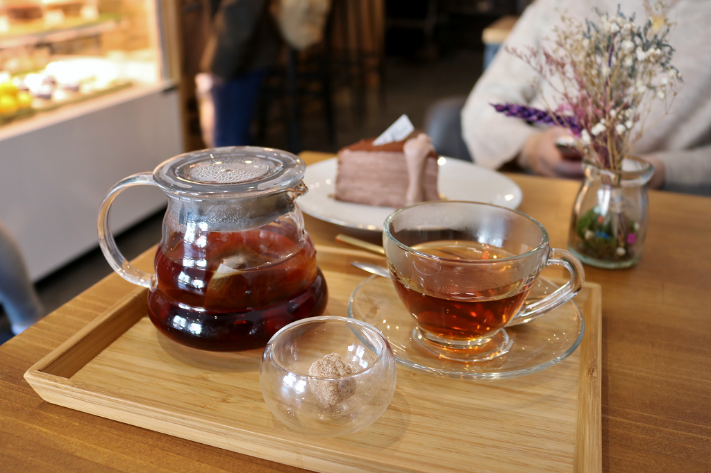 我很喜歡瑪黑兄弟的茶葉,甜點就是要配壺熱茶,不知道為何(可能是比例吧!因為回沖時又裝一樣少….,所以推測是刻意的),第一次上桌壺裡的水就只泡到如圖那樣,整個就是離裝滿還有一大段距離,所以又請店家再幫我們多加一點熱水,可以回沖,即使回沖也不輸第一壺,很適合兩人合點。