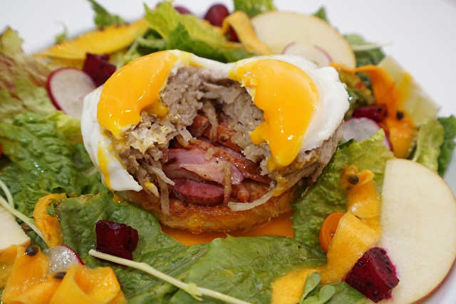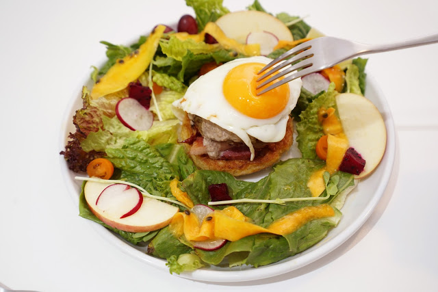 這份獨創的煙燻鴨肉米粉佐百菇醬汁與太陽蛋,取自新竹著名的在地食材--米粉,將新竹米粉做成米粉煎餅,再層層疊上煙燻鴨肉片、淋上濃郁醇厚的白菇醬,最後放上一個煎得軟嫩的太陽蛋在最上面,視覺上就已經超美味。